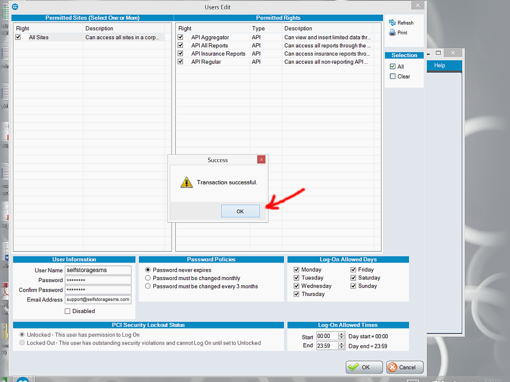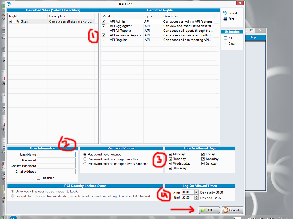 - Select "All Sites" and all 5 of the "Permitted Rights" as shown.