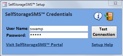 - Enter the API Username and API Password created during the SelfStorageSMS FREE TRIAL sign-up.